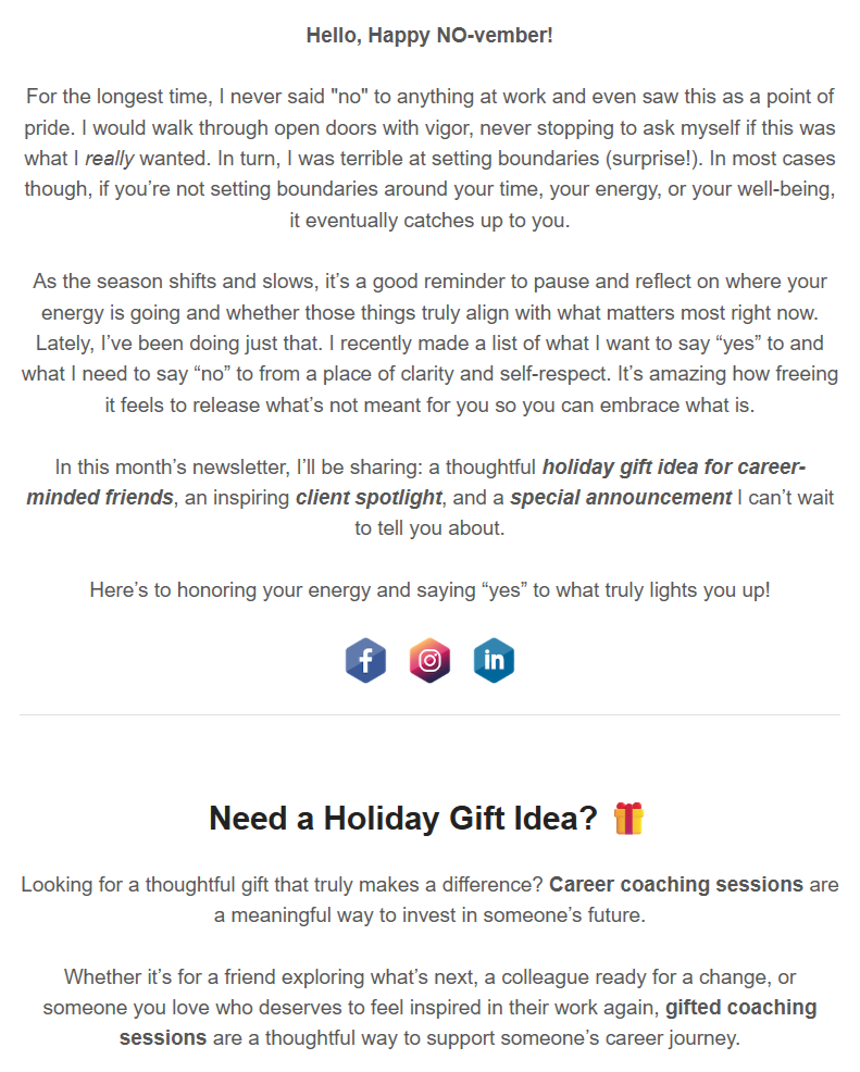 Welcome NO-vember: Healthy work boundaries, holiday gift idea, and Leah’s client story!